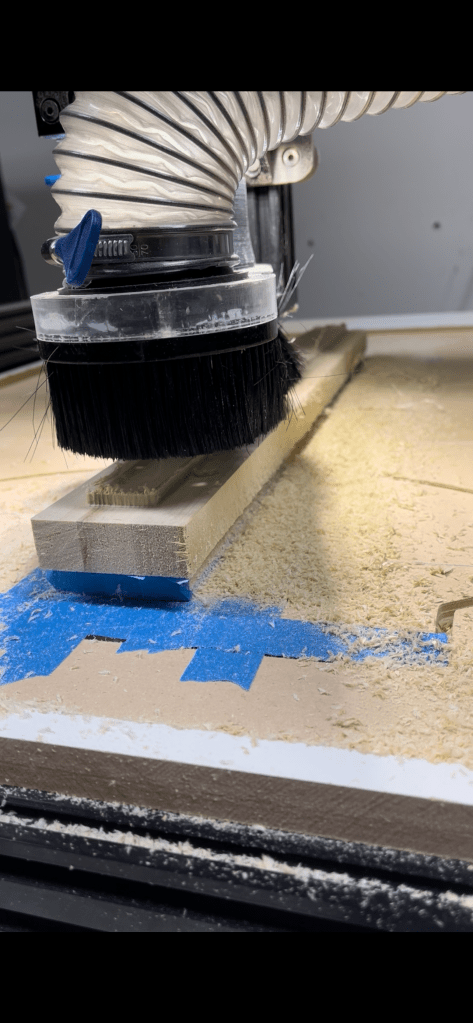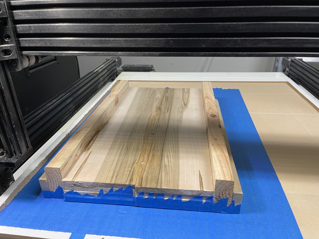 If you’re wondering about all the painter’s tape, it’s a trick I learned by watching the openbuilds videos. With a clean surface you put the tape down on your bed, a bit bigger than your stock. Same thing with the underside of the stock. Then you superglue the two sets of tape together. Then you let the glue cure, it only takes a few minutes or so, and you can use accelerant that makes it almost instant. Now you have secured your stock to the table but are able to remove the superglue via tape and have a clean bottom to your wood. But you need to make sure that: 1. You have the tape on the table covering enough area to resist the pressure of your routing bit moving horizontally through the stock; 2. You have enough surface area on the bottom of your stock to hold it down and resist the forces trying to push it around. Nothing in this project has been a problem with that second consideration, but I had a couple of catastrophic failures because of the first one.
