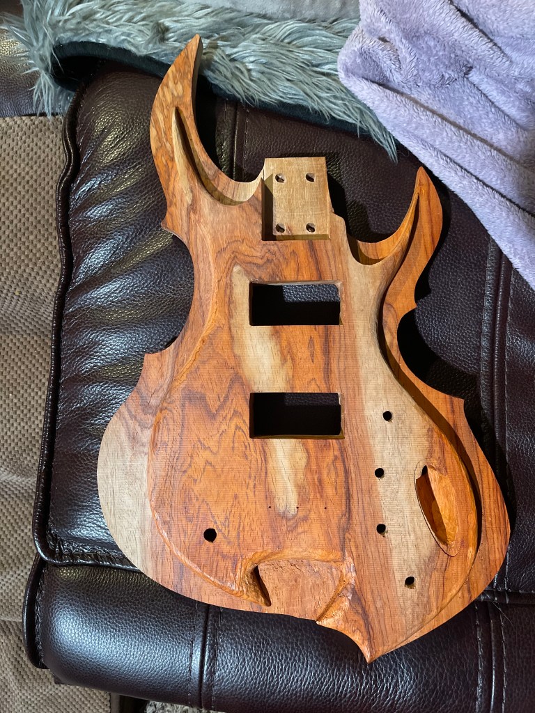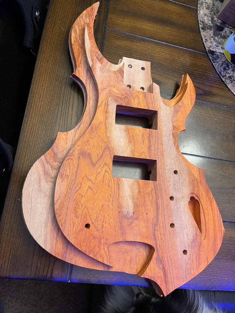 I found 4 main sites that carried body blanks that I was interested in purchasing in. The first, StewMac.com, pops up any time you google for guitar making supplies. After looking around for a bit I had a better idea of the names for things I was looking for. A body, neck, and fingerboard (or fretboard) blank. After searching for electric guitar body blank, guitar neck blank, and guitar fingerboard blank, along with StewMac, my second site kept coming up, ExoticWoodZone.com. And after a long night of searching, I came across my third. I can’t remember the details, but they had some beautiful wood and the option to select your specific piece. That site is Maderasbarber.com. Another spoiler: I have since purchased from all of these sites, and was happy with all of them. But note, Maderas Barber is shipping from Spain, and the wood you’re buying can be pretty heavy, so be prepaired for some shipping fees, and be prepaired for some shipping times. My wood was shipped fast via Fed Ex, but stalled out in one Franch depot for about a week and then again in New Jersey for another 4 days. But again, they had some beautiful woods, I was able to pick my specific piece, and the people I had contact with were super friendly, helpful, and quick to get back to me.