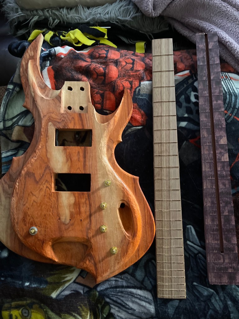 Finally, this last one came out fine. Slightly offset, but I made sure to leave myself some room for sandpaper corrections. Fretboard, some black walnut, came out fine on the first try too!