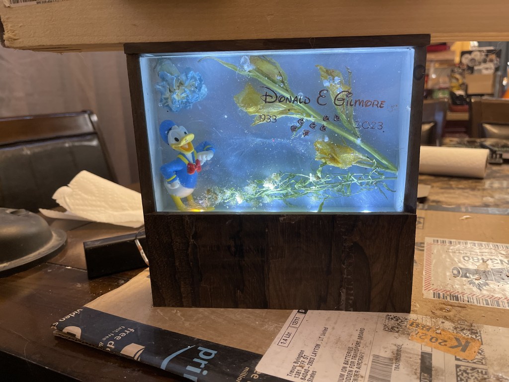 My wife wanted to make some memorials for her grandfather that she could give out to her family. She took one of this Donald Duck figurines, of which he had many, and some of his funeral flowers and encased them in resin. Once she had the blocks done, she wanted me to make little boxes for them that could be lit up from below with some LEDs.