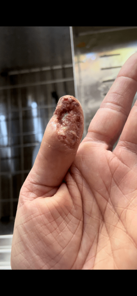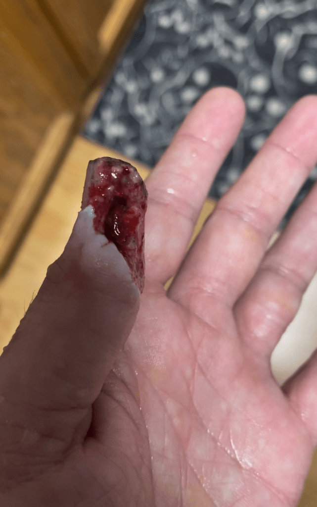 Once at the ER we checked in and still no one but me knew how bad the cut was because the pressure I was holding on it was keeping it from bleeding all over the place. After the intake they gave me a wheelchair because of how pale my face was and they knew I was fighting off passing out. Then back in the waiting room I decided to actually look at how bad it was. I asked my wife if she could see the bone or if it was just muscle or something. At that point she realized it wasn’t just a little “boo boo” cut. That’s when the blood really began flowing.