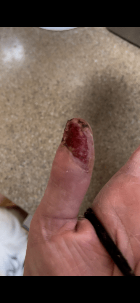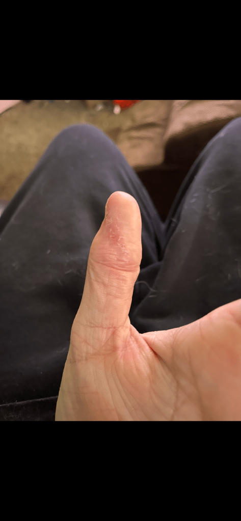 I know sometimes descriptions just don’t get a real sense of how bad something is, so in the spirit of finalizing my excuse for not being here, I am going to post the pictures of my thumb. If you have a weak stomach, or a strong sympathy response to injuries, I don’t recommend going any further. I have a strong sympathetic response and even fainted once at a book reading (“Guts” by Chuck Palahniuk). I am the kind of person I am warning not to look.
