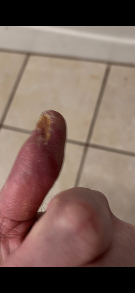 I asked the intake people for something to help keep the blood from running all over the floor. They asked to look at it. Then they quickly got me back to a room. The nurses kept asking why I hadn’t let them know how bad it was earlier. I just didn’t want to take the place of someone who needed it more. As they gave me more and more morphine I kept appologizing for bleeding all over the room (it’s crazy how many places the blood gets from a cut).